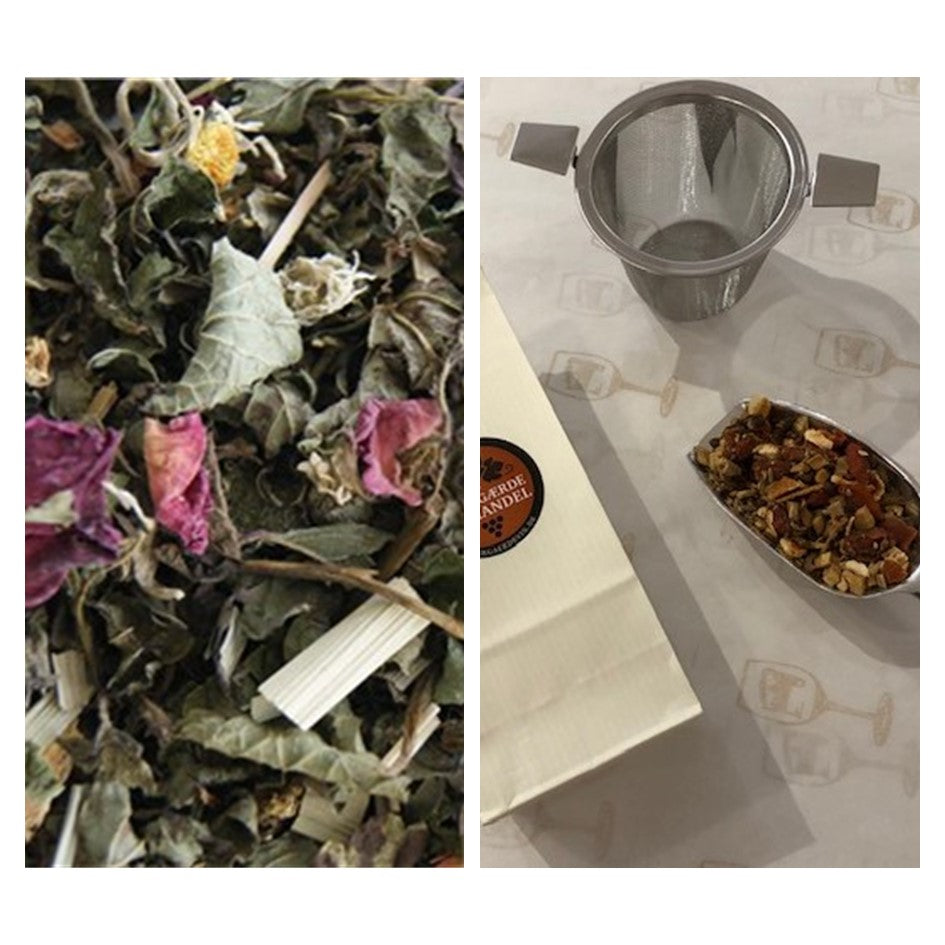 Ingredienser: Citronmelisse, lakridsrod, pebermynte, jasmin, citrongræs, hyldeblomster, lyngblomster, marokkansk mynte, bellisblomster, mørke roser, frysetørrede jordbærstykker.