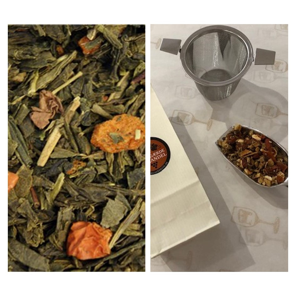 Ingredienser: Grøn Sencha te, tørrede æblestykker (10 %), frysetørrede kvæde- stykker (3 %) og aroma.