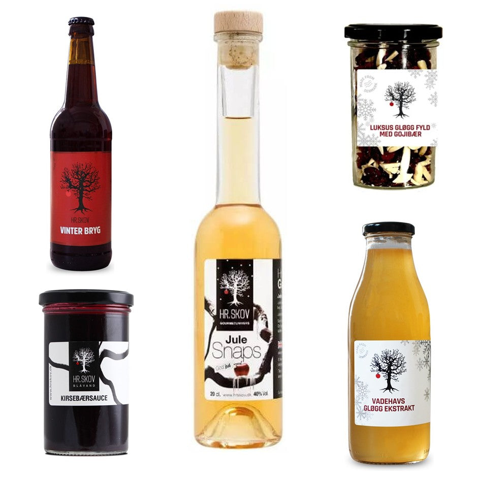 Jule Gaven fra Hr. Skov indeholder 1 Vinterbryg, 50 cl., 1 Jule snaps, 20 cl., 1 Vadehavs gløgg 50 c., 1 glas Kirsebærsauce og 1 glas Luksus gløgg-fyld.