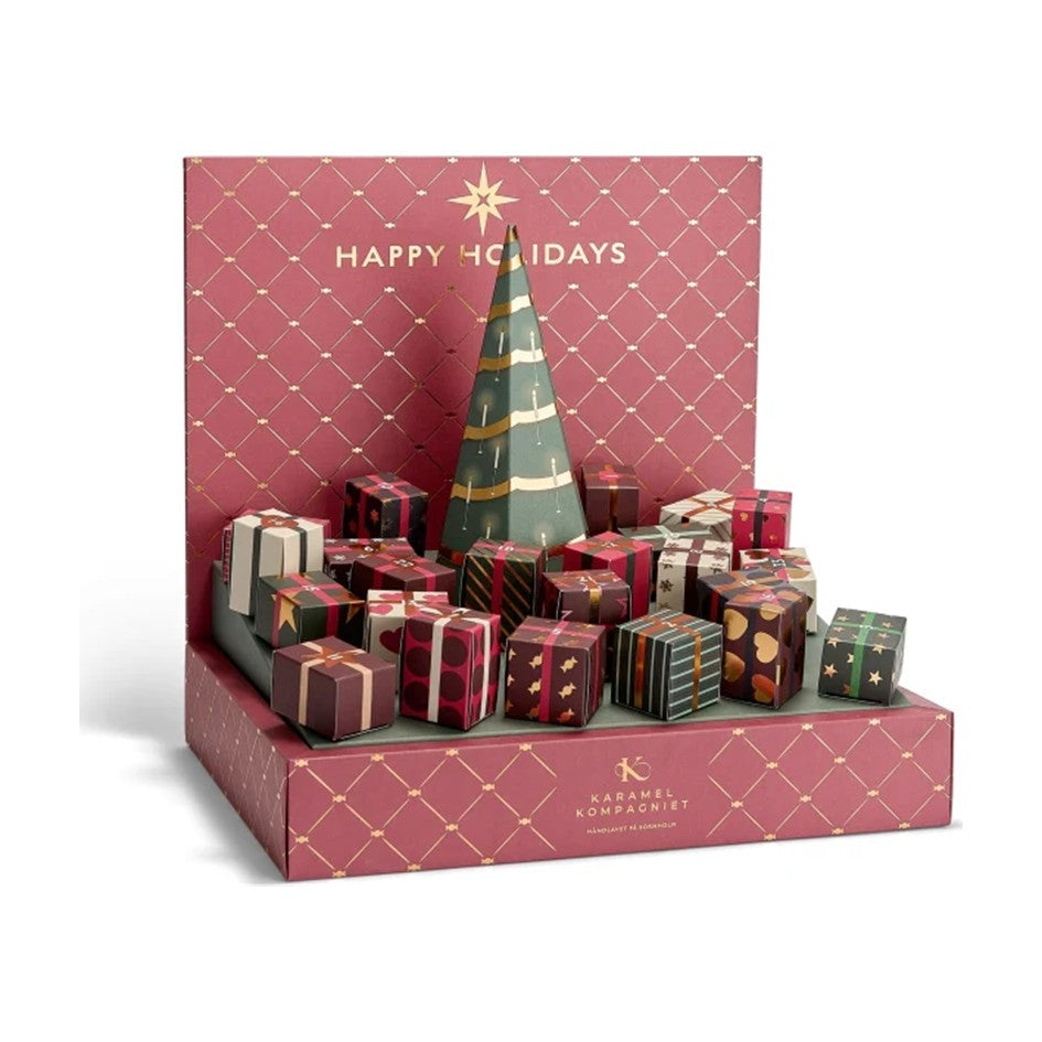 Vores nye julekalender er plastikfri, lavet af FSC-certificerede materialer – og så er karamellerne pakket i komposterbart cellofan, med OK Compost Home certifikat. Husk at affaldssortere efter dine lokale muligheder.