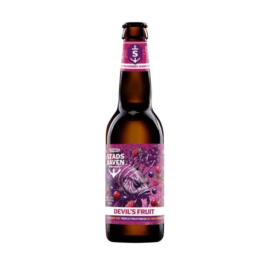 Stadshavens smukke Devil’s Fruit skinner lyserødt og indbydende når den med rund hånd skænkes. Vi har at gøre med en forførende frugt øl, der indeholder modne kirsebær, de mest dybrøde hindbær samt et kærkomment strejf af solbær. Det skaber en fantastisk smag, der indhyller den drikkende i velvære og nydelse. Prøv en Devil’s Fruit og bliv forundret over friskheden og de læskende kvaliteter, som kun en så udsøgt frugt øl kan levere.