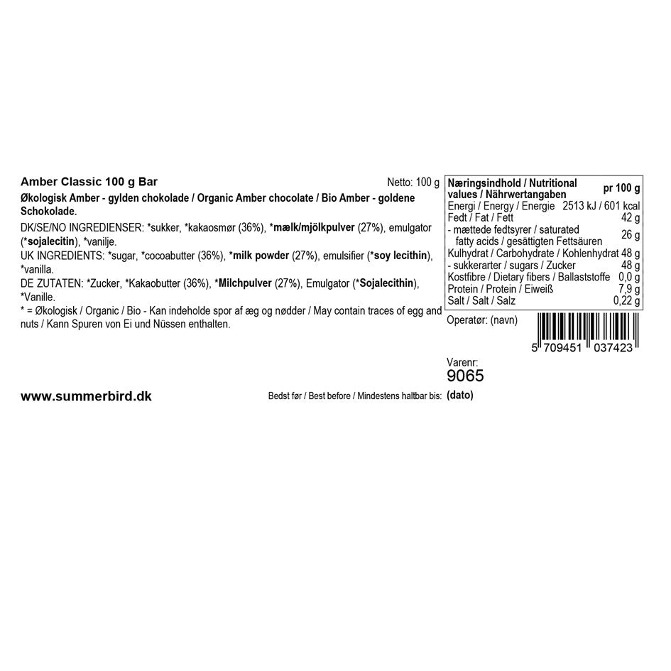 Amber Classic har en sød, let bitter og cremet tone, der henleder tankerne mod den klassiske franske dessert crème brûlée. Chokoladens komplekse og mangfoldige smag gør den meget populær som ren spisechokolade, til desserter og bagværk. Amber-chokoladen vandt guldmedalje i “European Chocolate Awards" i 2015, 2017, 2018 og 2019