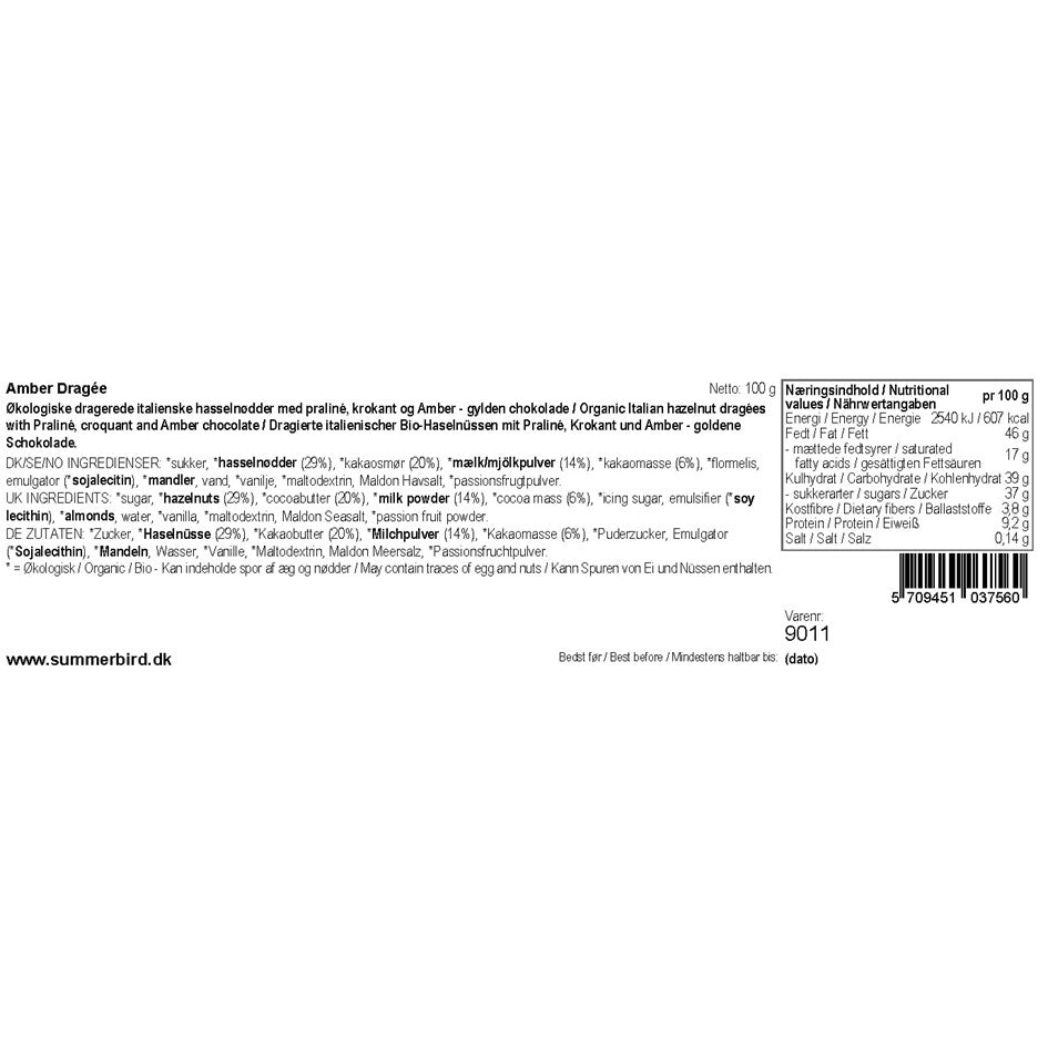 Let ristede italienske hasselnødder, drageret med et tyndt lag nougat, granulat af krokant og afslutningsvis et tykt lag Amber Classic-chokolade. Resultatet er en enkel, rig og raffineret smag, som henleder tankerne mod den klassiske franske dessert crème brûlée.