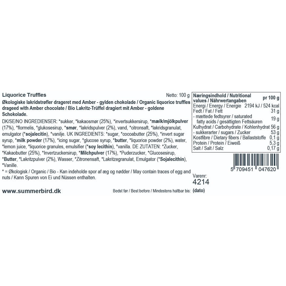En raffineret lakridstrøffel med en kerne af karamelganache tilsmagt med italiensk lakrids, omsluttet af vores gyldne og silkebløde Amber Classic-Chokolade tilsat rålakrids. En trøffel med karamelliserede undertoner samt intensitet og dybde fra den cremede lakridsganache.
