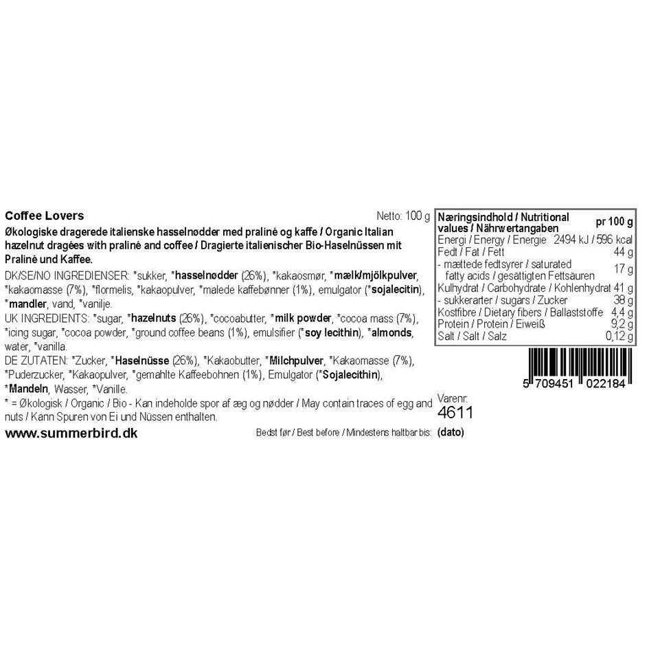 Let ristede italienske hasselnødder, drageret med et tyndt lag praliné, kaffe og Summerbirds prisvindende Amber classic-chokolade og afslutningsvis vendt i kakaopulver og florsukker. Opskriften er enkel, resultatet er formidabelt. En hasselnød, der henleder tankerne på en god caffe latte.
