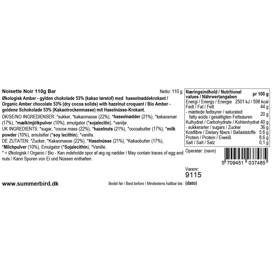 Nuanceret Amber Noir-chokolade er i denne gastronomiske udgave dekoreret tæt med både krokant af og let ristede Piemonte hasselnødder. Resultatet er en dekadent og raffineret chokoladebar fyldt med stor smag og tekstur.