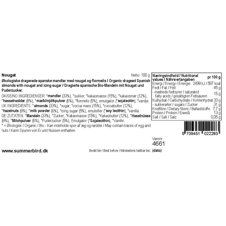 Let ristede spanske mandler, drageret med et tyndt lag nougat og mælkechokolade 49 % og afslutningsvis vendt i fnuglet florsukker. En Summerbird-klassiker, hvor råvaren, håndværket og traditionerne spiller hovedrollen.