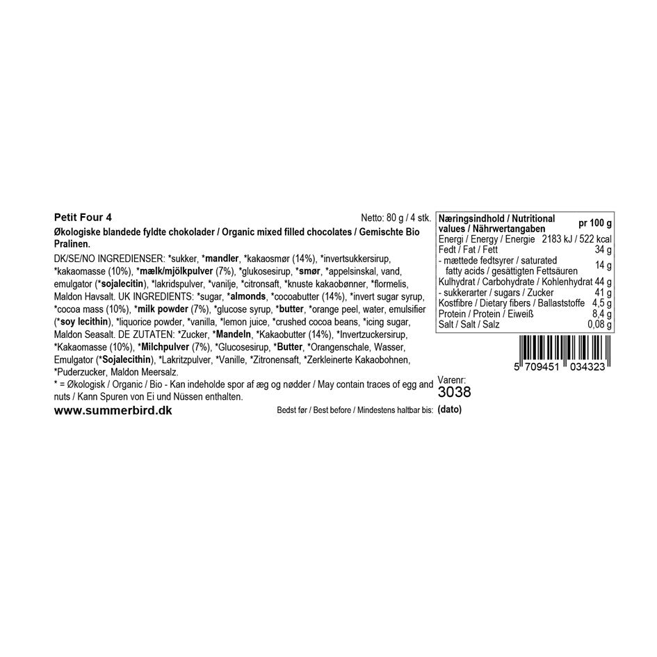 Gaveæsken indeholder 4 forskellige varianter af Summerbirds ikoniske Petit Four-stykker. Æsken byder på en verden af velsmag og egner sig perfekt til alle, som sætter pris på klassisk velsmag, godt håndværk og fantastiske råvarer.
