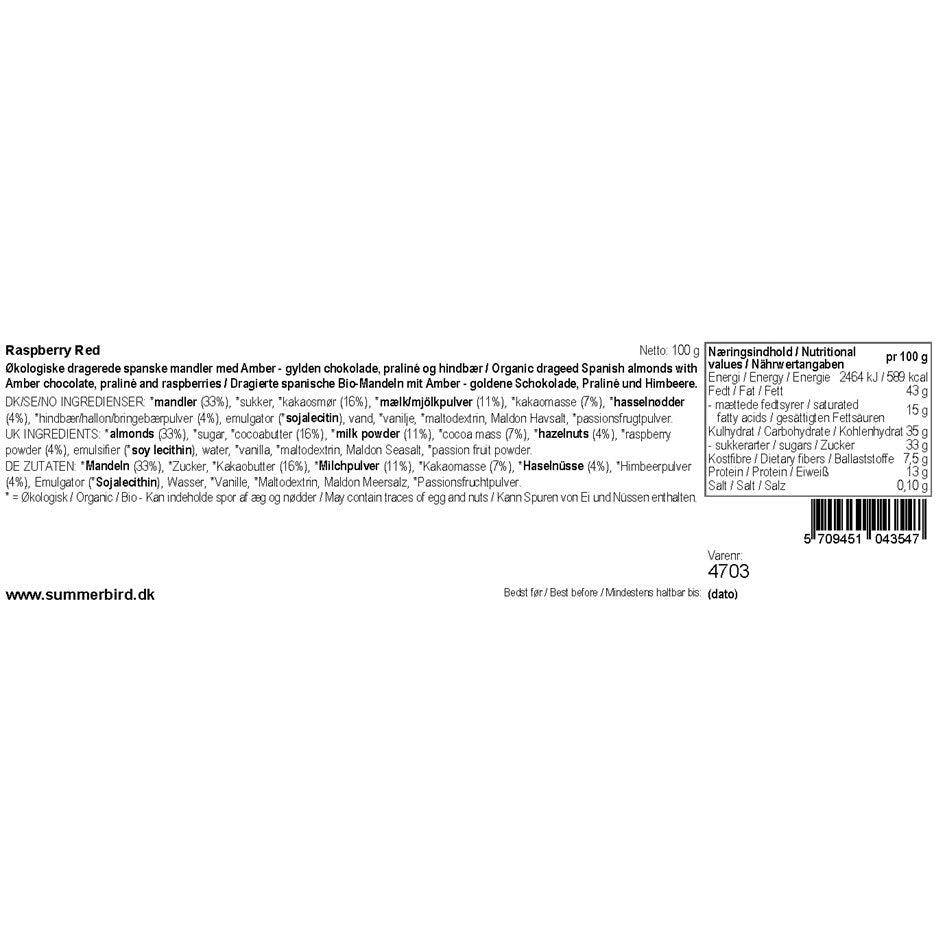 Let ristede spanske mandler, drageret med et tyndt lag praliné og mælkechokolade 49 % og afslutningsvis vendt i det fineste pulver af solmodne hindbær. En harmonisk og unik mandel fyldt med konsistens og frugtighed.